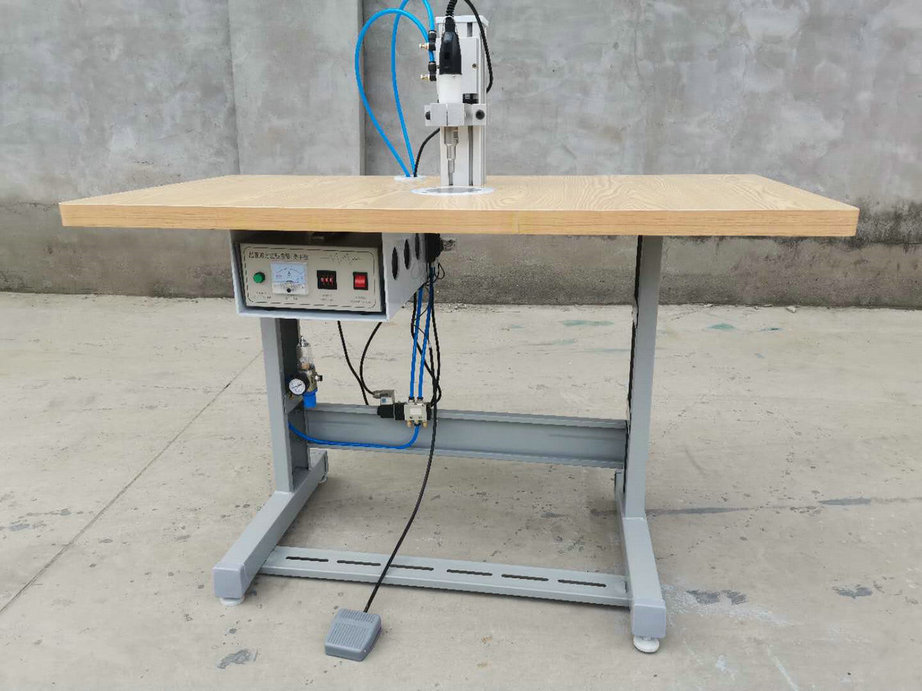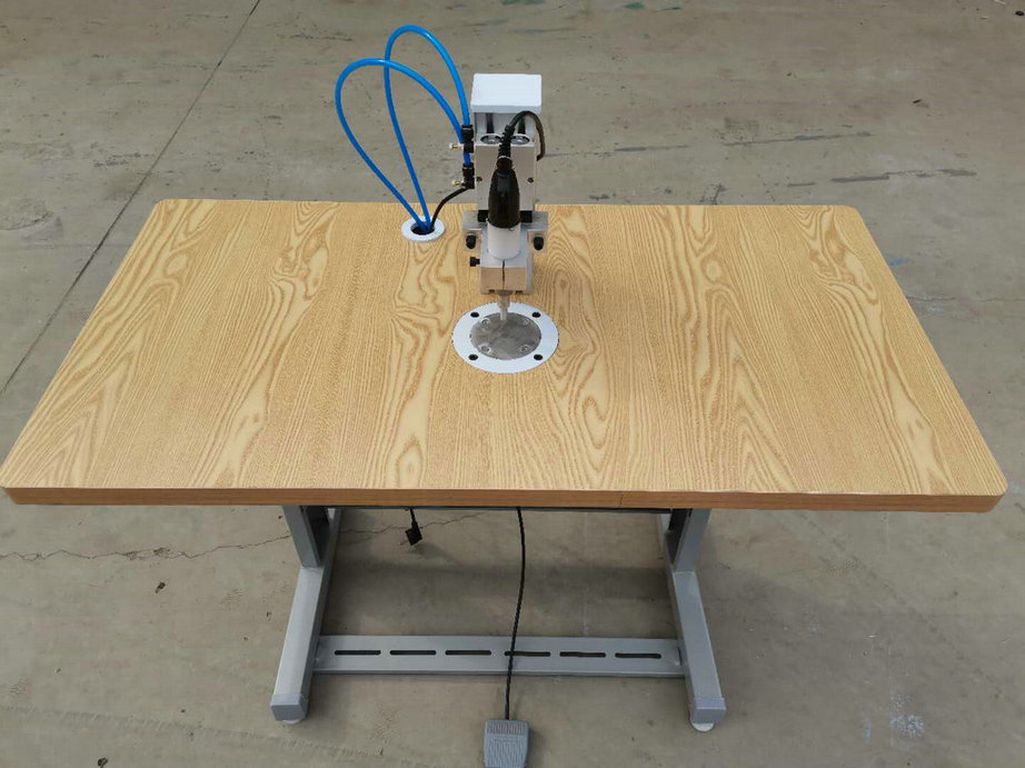 本機以超聲波將綁帶融合于口罩本體兩側(cè),進(jìn)而完成綁帶式口罩成品,只需一名操作員將口罩片置于超聲波發(fā)生器的頭上,后將綁帶放在口罩片上,腳踏踏板使氣缸向下運動,縫住綁帶和口罩片。
